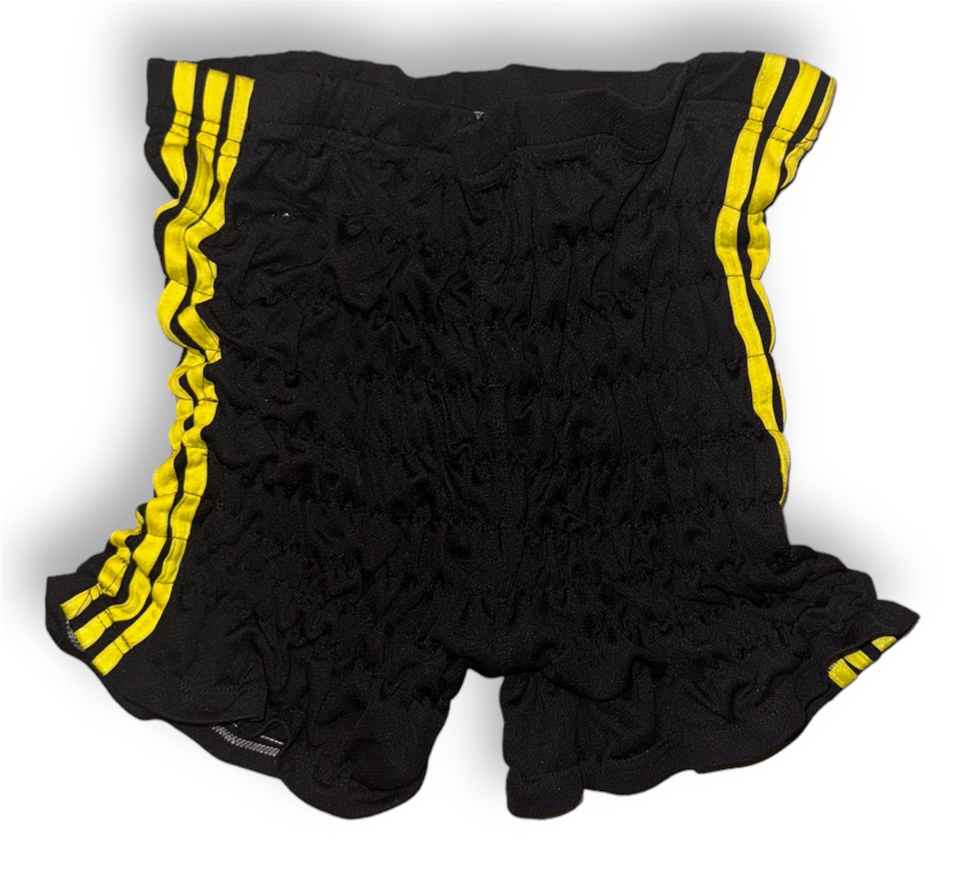 Shirred Black and Yellow Shorts S/M. Each pair of our Sport Shorts are hand picked and completely unique and hand crafted. One of each piece means you get something unique to you, and sustainable for the environment.